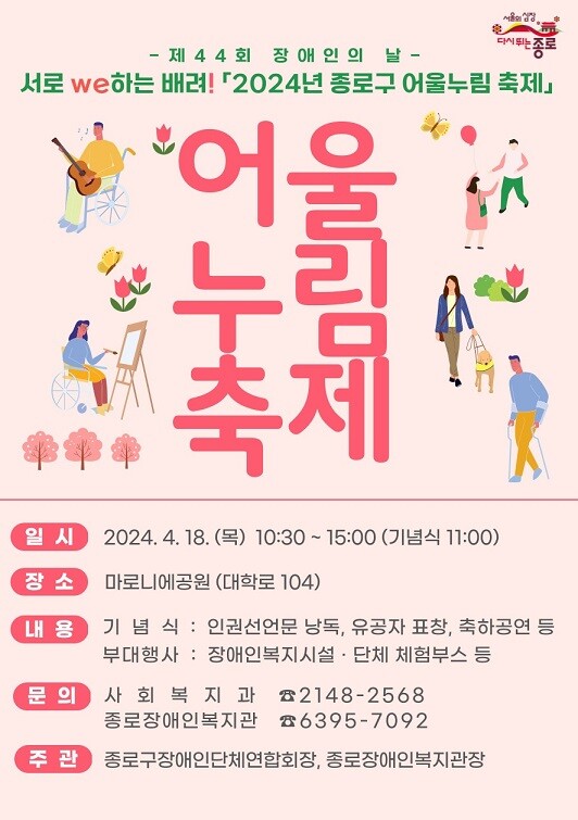 서울 종로구(구청장 정문헌)가 제44회 장애인의 날을 기념해 18일 오전 10시 30분~오후 3시 마로니에 공원(대학로 104)에서 「서로 we하는 배려! ‘2024년 종로구 어울누림 축제’」를 개최한다.