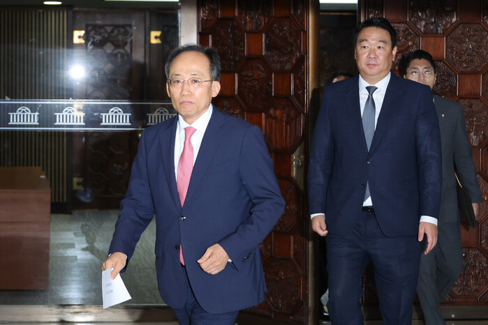추경호 원내대표는 이날 국회에서 비공개 의원총회를 열고 이 같은 안건에 대한 추인 절차를 밟았다.