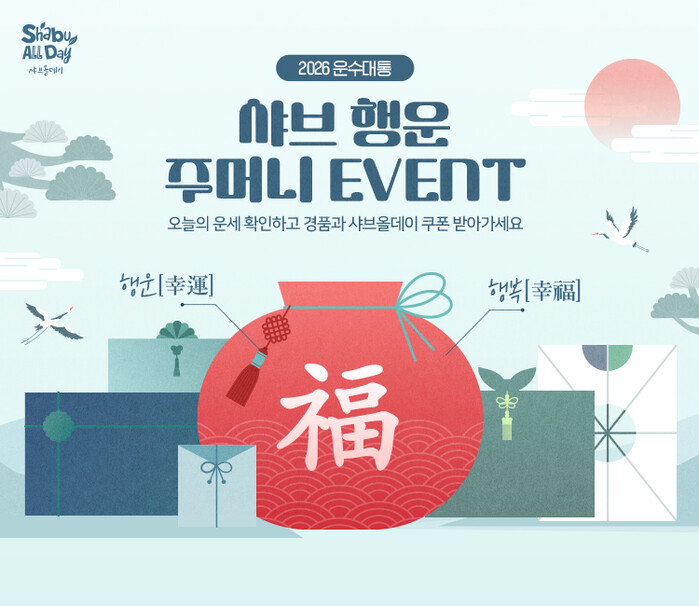 이번 이벤트는 새해를 여는 행운을 콘셉트로 기획된 참여형 이벤트로, 고객이 직접 ‘행운 주머니’를 열어 자신의 운을 확인하는 방식으로 진행된다. 이벤트 참여는 행운 주머니 열기 후 이벤트 페이지에 접속해 본인 휴대폰 번호를 입력하면 완료되며, 이후 메시지를 통해 행운권과 쿠폰, 경품 당첨 여부를 확인할 수 있다. 이벤트는 샤브올데이 회원을 대상으로 운영되며, 기간 내 1인 1회 참여 가능하다.