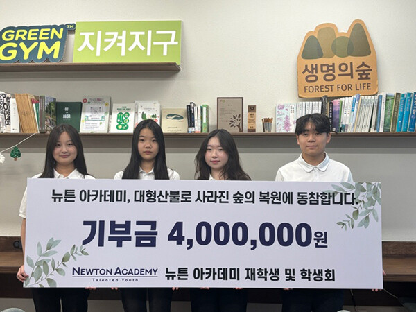 최근 몇 차례 발생한 산불로 인해 많은 피해자가 발생했고, 기후변화 및 자연환경 문제에 대한 관심이 더욱 커지는 가운데, 글로벌 이슈에 민감한 뉴튼아카데미 학생들은 기부 대상을 산불 피해 복구와 피해자 지원에 집중하고자 ‘다시, 숲’ 프로젝트를 선택했다. 이 프로젝트는 산불로 훼손된 산림 생태계를 복원하고, 산불 피해 지역 주민과 환경에 실질적인 도움을 주기 위한 활동을 진행하고 있다.