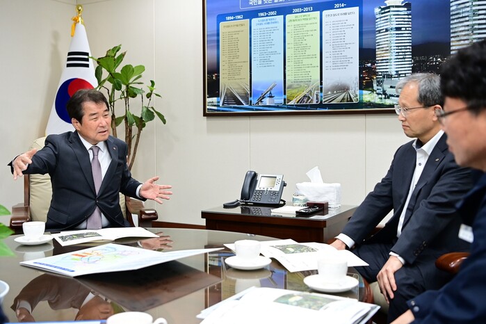 [김천=박병상 기자] 김충섭 김천시장은 십자축 철도망 구축의 조기 착수와 철도산업 인프라 확장 지원 요청을 위해 지난 17일(월) 국가철도공단 이사장을 방문 면담했다.