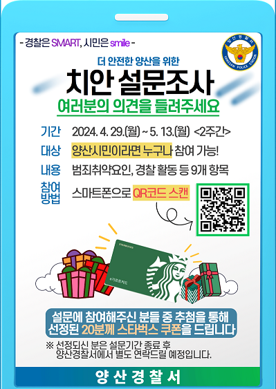 설문조사는 양산경찰서 홈페이지, 러브양산맘, 웅상이야기 등 온라인 커뮤니티 사이트에 게시된 QR코드 또는 링크 접속을 통해 참여 가능하고, 참여 시민 20명에게는 추첨을 통해 커피 쿠폰을 지급할 예정이다.