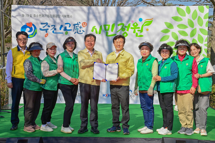 진주시와 그린협약을 체결한 중소벤처기업진흥공단은 지난 1일 진주종합경기장 근린공원 내 진주시민의 숲에서 제79회 식목일과 진주 이전 10주년을 기념하는 ‘중진공감 시민정원 조성’ 행사를 진행했다.