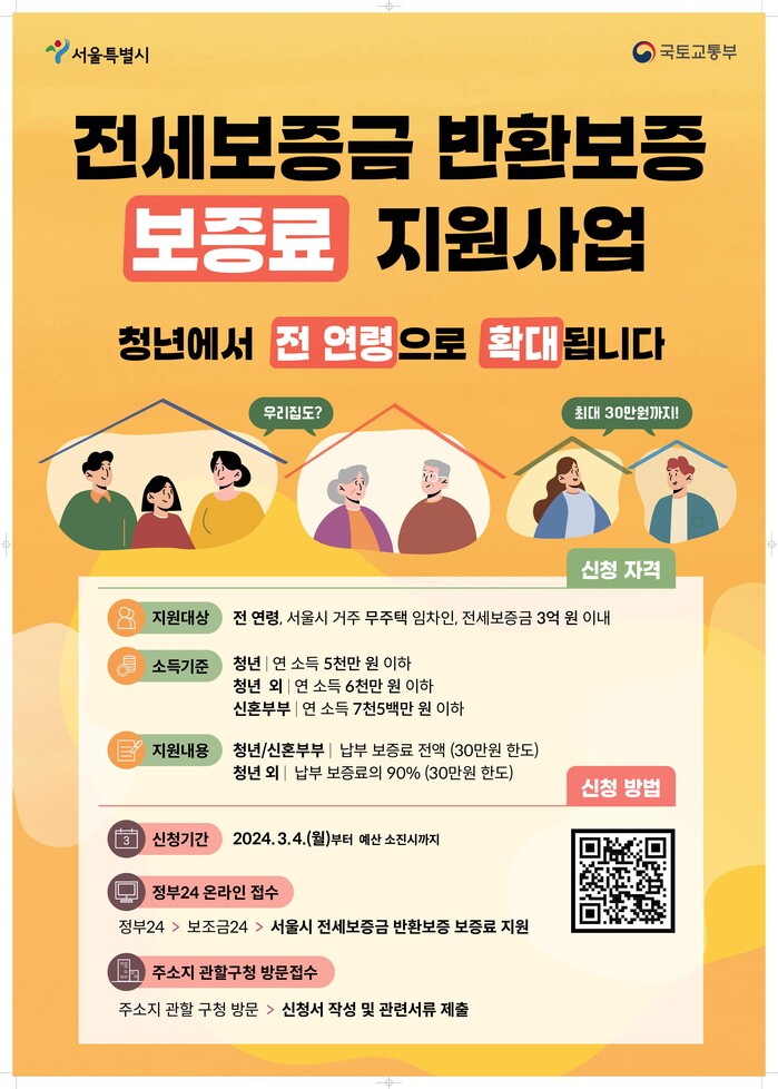 지난해 청년층을 대상으로 지원하던 전세보증금 반환보증 보증료를 올해부터는 전 연령층으로 확대하여 최대 30만 원까지 지원한다.