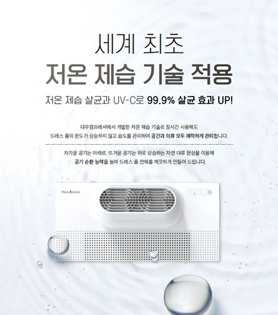 ‘네오아미코 드레스케어’는 자체 개발한 초소형 인버터 컴프레셔를 사용해 여름철에도 유용하게 사용할 수 있도록 ‘저온제습’ 기능을 갖추었다. 이 기능을 활용하면 기존의 제습기와 다르게 시원한 바람이 토출되고, 세균과 바이러스가 살기 힘든 쾌적한 환경을 조성해 살균 효과를 극대화 한다.