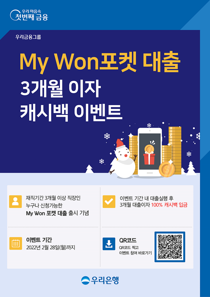 [시민일보 = 홍덕표 기자] 우리금융지주 자회사 우리은행은 직장인 대상 모바일전용 신용대출인 ‘My Won 포켓 대출’ 상품 출시를 기념해 3개월 이자를 돌려주는 이벤트를 오는 2022년 2월28일까지 실시한다고 밝혔다.
