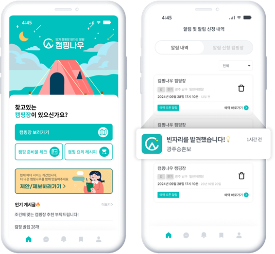 ‘캠핑나우’는 인기 캠핑장을 예약하기 위해 밤 지새워 기다리지 않더라도 저렴한 가격에 인기가 많은 국립 야영장 알림까지 받을 수 있는 실시간 캠핑장 빈자리 알림 어플이다.