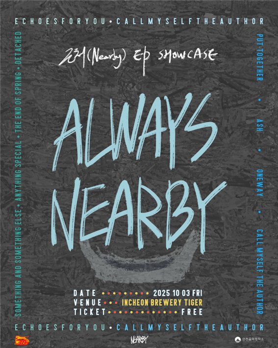 인천을 기반으로 활동하는 밴드 근처(Nearby)가 인천음악창작소 음반제작지원사업에 선정된 두 번째 EP 〈스스로를 작가로 칭한다〉의 발매를 기념해 쇼케이스 〈ALWAYS NEARBY〉를 연다. 이번 공연은 오는 10월 3일 인천맥주 호랑이에서 개최된다.