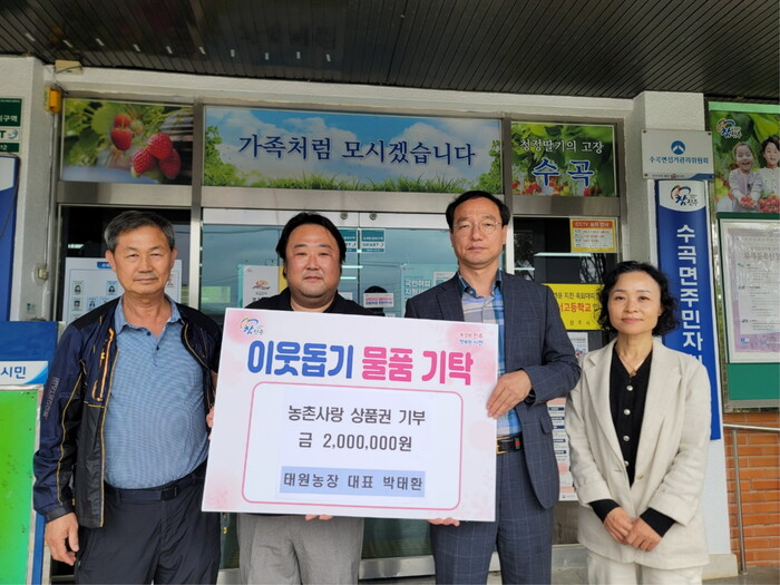 진주시 수곡면 태원농장(대표 박태환)은 지난 22일 어려운 이웃에게 전달해 달라며 농촌사랑상품권 200만 원을 수곡면사무소에 기부했다.