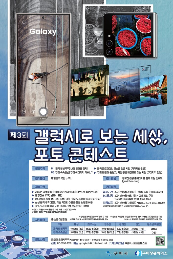 올해로 제3회째를 맞은 사진 공모전‘갤럭시로 보는 세상, 포토 콘테스트’는 삼성전자 휴대전화로 촬영한 사진을 출품하는 이색 공모전으로 큰 주목을 받고 있으며, 전국 근로 현장의 모습과 구미를 홍보할 수 있는 배경 2가지 주제로 진행된다.