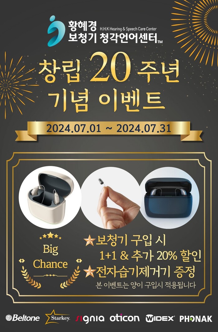 황혜경보청기 청각언어센터 관계자는 “이번 이벤트는 창립 20주년을 맞이해 특별하게 준비”했다 며 “최신식 보청기를 합리적으로 구입할 수 있는 혜택을 통해 많은 분들이 적합한 보청기를 찾아 만족스럽게 사용하기를 바란다”고 전했다.