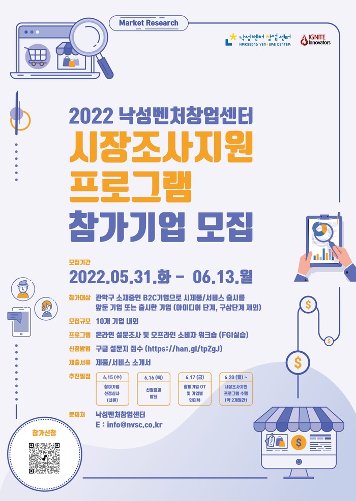 모집 기간은 오는 6월 13일(월)까지이며, 구글 설문지를 통해 신청서를 작성하고 제품이나 서비스의 소개서를 첨부 후 접수하면 된다. 모집 결과는 선정 심사를 거쳐 오는 16일(목) 발표되며, 참여기업은 17일(금) 낙성벤처창업센터에서 진행되는 프로그램 OT에 참석해야 한다.