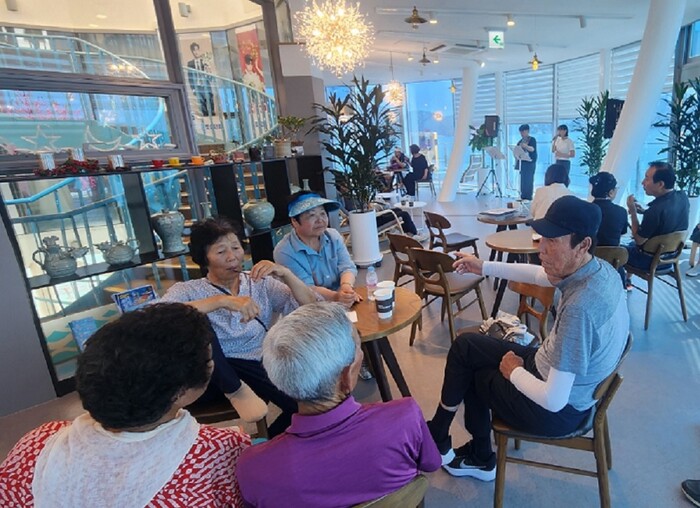| ▲ 마량항 앞바다의 아름다운 풍광을 한눈에 조망할 수 있는 마량전망대카페에서 관광객들이 버스킹 공연과 함께 즐거운 한때를 보내고 있다. / 강진군 제공 |