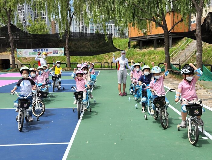 | ▲ 강동 바이크스쿨 참가 아동들이 교통법규 등 자전거 교통안전 교육을 받고 있다. (사진=강동구청 제공) |