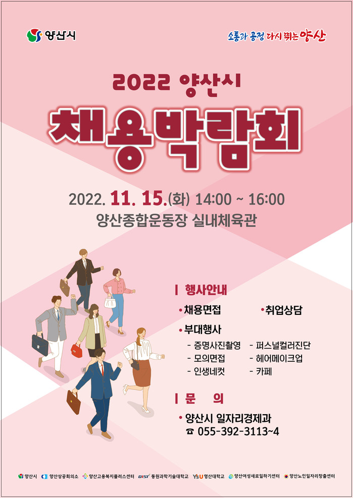 이번 행사는 양산시가 주최하고 양산상공회의소, 양산고용복지플러스센터, 동원과학기술대학교, 영산대학교, 양산 여성 새로 일하기 센터, 양산노인일자리창출지원센터가 함께한다.