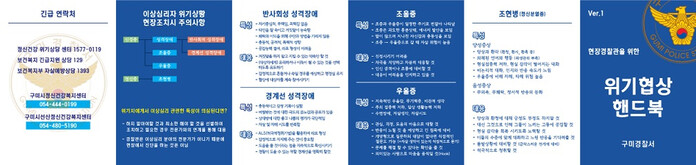 [구미=박병상 기자] 구미경찰서(서장 김동욱)는 지난 9일 투신자살 시도 등 위급 상황 현장에서 요구조자의 심신 안정, 구조에 필요한 대화 기법 등을 수록한「위기 협상 핸드북」을 제작해 일선 지구대·파출소 등에 배부했다고 밝혔다.