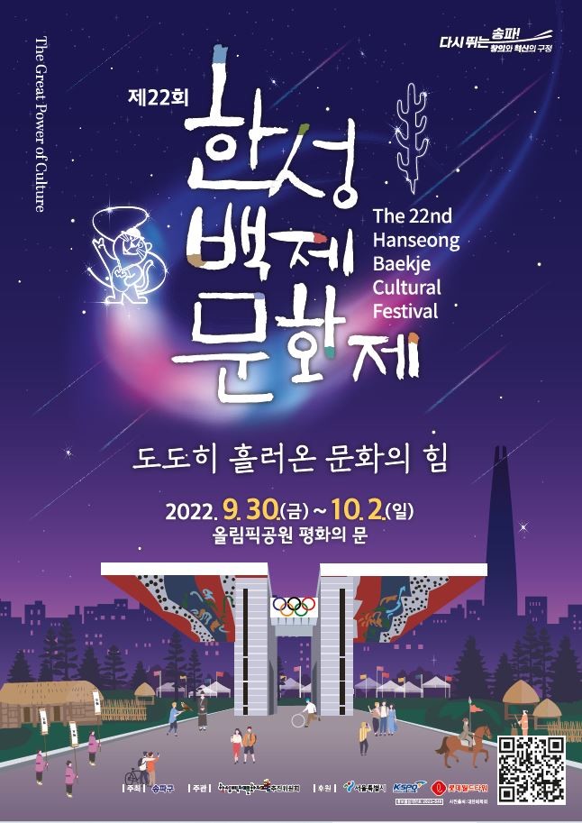 오는 10월2일까지 올림픽공원 평화의 문에서 개최되는 한성백제문화제는 백제부터 오늘에 이르기까지 ‘도도히 흘러온 문화의 힘’을 주제로 송파구만의 위대한 문화유산을 조명하고, 다가올 내일의 메시지를 전한다.