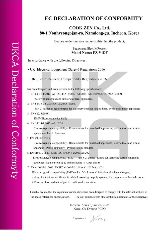 (주)쿡젠 (대표 강옥경)이 냄새와 연기를 없애주는 친환경 무연구이기 전기로스타 EZ-V1DF 모델이 일본 전기용품안전인증(PSE) 획득에 이어 유럽연합(EU)에서 브렉시트한 영국의 새로운 인증 제도인 “UKCA(UK Conformity Assessed)”를 전기로스타 업계 최초로 획득을 했다고 16일 밝혔다.