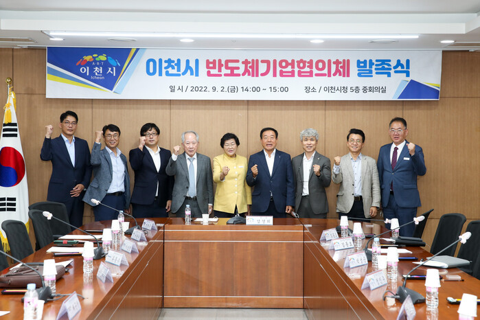| ▲ 반도체기업협의체 발족식에 참석한 김경희 시장(가운데)이 기업 관계자들과 함께 기념촬영을 하고 있다. (사진=이천시청 제공) |