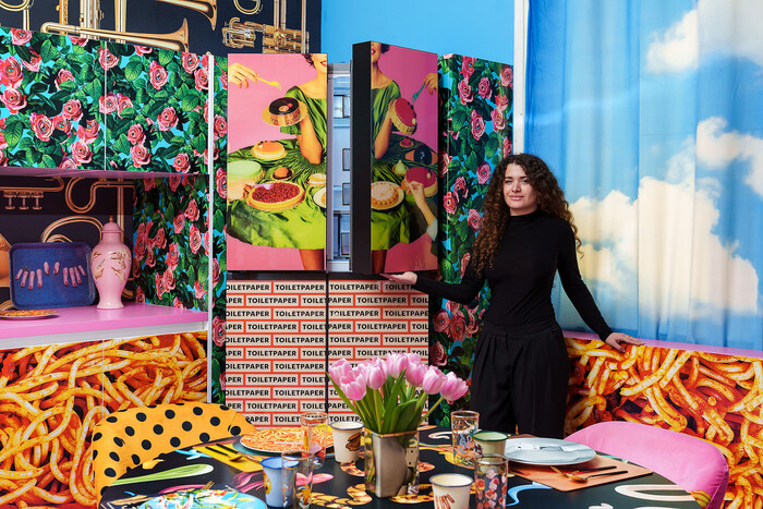 | ▲ 삼성전자 모델이 이탈리아 밀라노에 위치한 '토일렛페이퍼 홈'에서 토일렛페이퍼의 가구ㆍ소품들과 함께 한정판 디자인 '비스포크 냉장고'를 선보이고 있다.(사진=삼성전자 제공) |