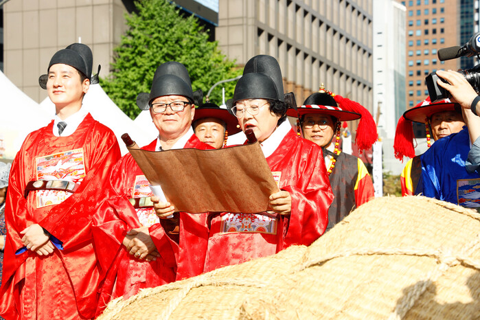 경기 이천시가 오는 10월22일부터 26일까지 열리는 ‘제24회 이천쌀문화축제’를 앞두고, 최근 서울 중구 청계광장에서 사전홍보행사를 개최했다. 사진은 김경희 시장(앞줄 오른쪽) 등 주요 참석자들이 조선시대 관복을 입고 이천쌀 진상 행렬을 재현하는 모습. (사진=이천시청 제공)