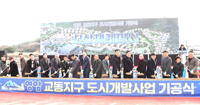 | ▲ 우승희 군수(왼쪽 아홉 번째)가 지난해 12월26일 영암읍 교동지구 도시개발 기공식에 참석한 내외빈 등과 시삽을 하고 있다. (사진=영암군청 제공) |