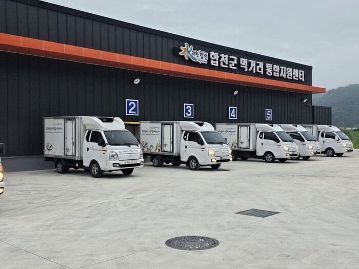 | ▲ 합천군 먹거리 통합지원센터에서 당일 출발하는 공공급식차량들. (사진=합천군청 제공) |