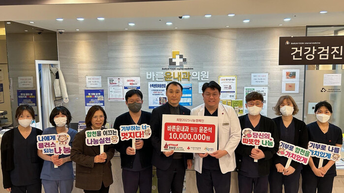 바른윤내과의원은 지역 의료 발전과 안전한 의료 공급을 위해 꾸준히 기여하고 있으며, 매년 1,000만원을 기탁해 지난해 사회복지공동모금회 ‘합천군 나눔 리더 2호’로 등록되는 등 지속적으로 나눔 활동을 실천하고 있다.