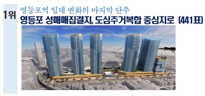투표 결과, 1위는 441표(16.84%)를 받은 ‘성매매집결지 정비’ 사업이 차지했다. 이어 2위는 ‘영중로·영등포로 보행친화거리 조성 사업’, 3위는 '0원 마켓'이 선정됐다.