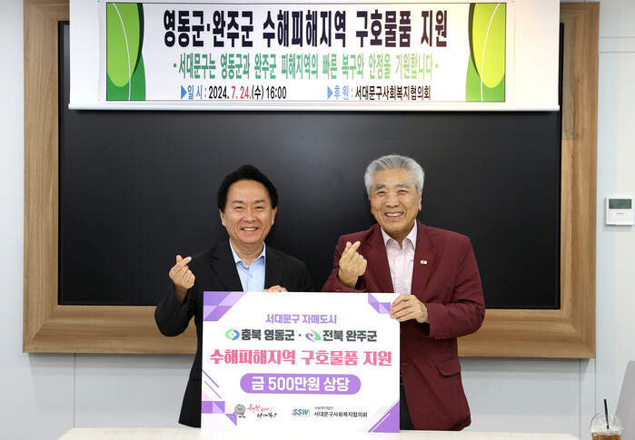 [시민일보 = 이대우 기자] 서울 서대문구(구청장 이성헌)는 자매결연도시인 충청북도 영동군과 전북특별자치도 완주군이 최근 집중호우로 수해를 입어 구호물품을 전달했다고 29일 밝혔다.