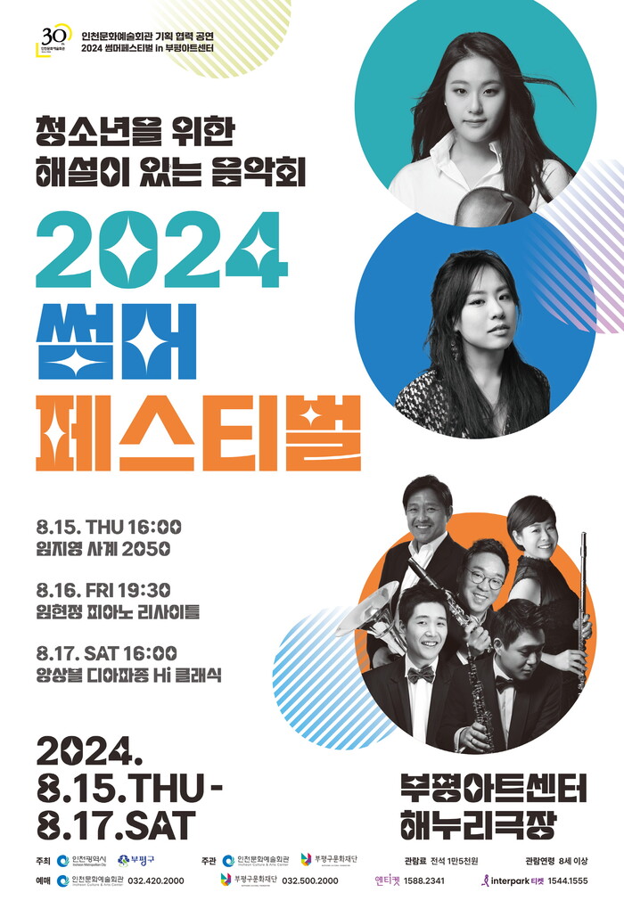 인천문화예술회관과 부평구문화재단이 기획협력공연으로 펼치는 ‘2024 썸머페스티벌’의 관람료는 전석 1만5000원이며, 인천문화예술회관 유료회원은 50% 할인, 부평구 소재 중·고등학생은 40% 할인받을 수 있다. 자세한 사항은 인천문화예술회관&부평구문화재단 홈페이지를 참고하면 된다.