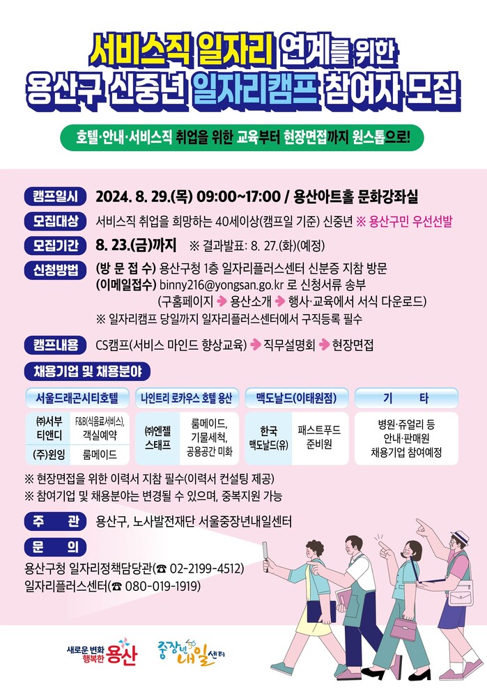 캠프는 이달 29일 용산아트홀 문화강좌실에서 ▲서비스 분야 직무 맞춤형 교육 ▲직무설명회 ▲현장 면접까지 원스톱으로 진행된다.