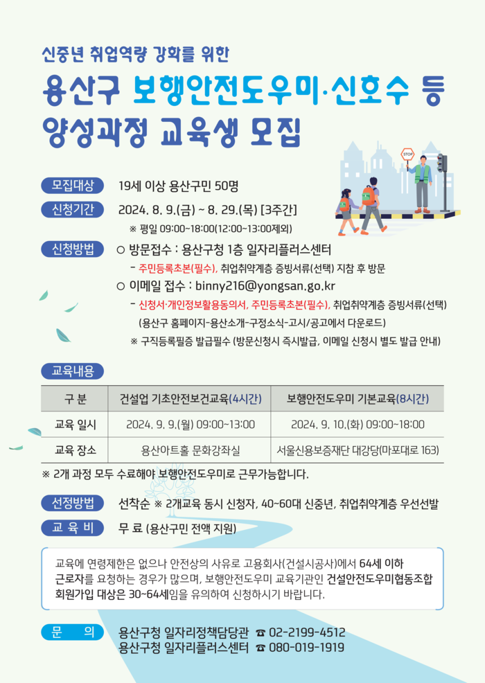 취업을 희망하는 40세 이상 신중년은 이달 23일까지 용산구청 1층 일자리플러스센터에 방문 접수 또는 구 누리집 ‘행사·교육’란에서 신청 서식을 내려받아 이메일로 신청 가능하다.