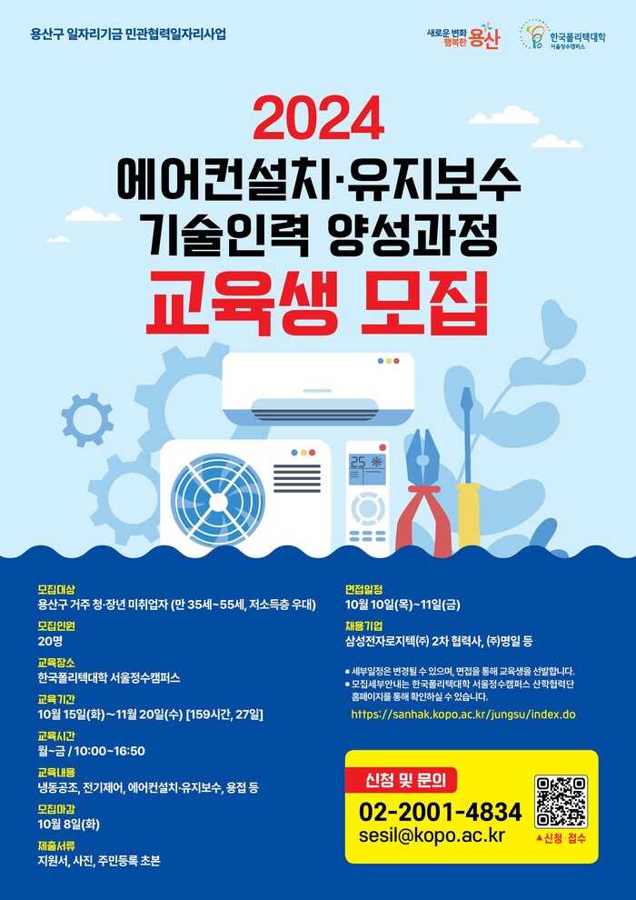 2024년 용산구 민관협력일자리 공모사업으로 선정된 에어컨 설치·유지보수 기술인력 양성 과정을 한국폴리텍대학 서울정수캠퍼스와 같이 운영한다. 기간은 10월15일부터 11월20일까지다.