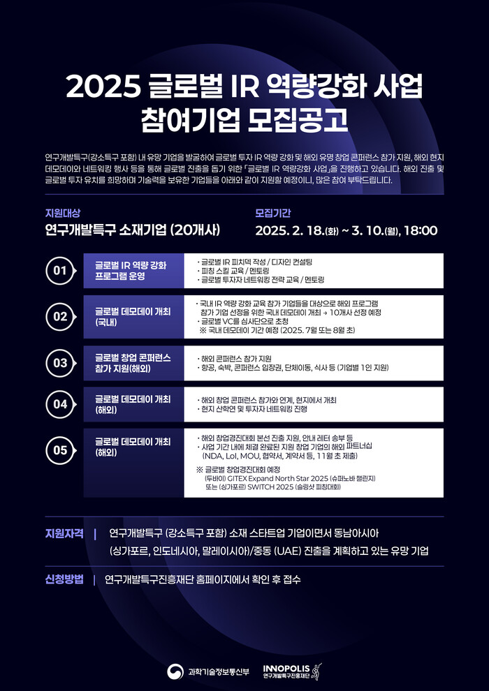 연구개발특구진흥재단이 과학기술정보통신부의 지원을 받아 글로벌 스타트업 육성을 위한 ‘2025년 글로벌 IR 역량강화 사업’ 참가 기업을 모집한다. 본 프로그램은 연구개발특구 내 혁신 기업을 대상으로 글로벌 투자 유치 전략을 지원하며, 피칭 교육, IR 컨설팅, 해외 벤처캐피털(VC) 미팅 및 글로벌 창업 경진대회 참가 기회를 제공한다.