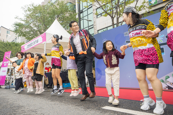 | ▲ 양천가족 거리축제에서 이기재 구청장(가운데)이 구민들과 함께 행사를 즐기는 모습. (사진=양천구청 제공) |