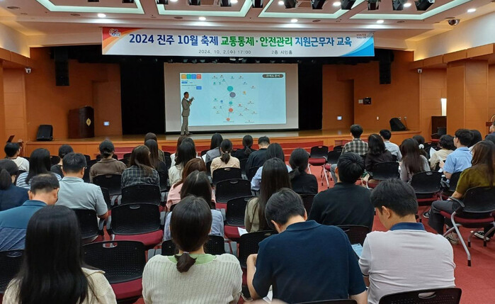 이번 교육은 10월 축제 안전관리요원으로 근무하는 진주시 공무원 100여 명을 대상으로 ▲10월 축제 인파 안전관리 교육, ▲10월 축제 교통통제‧안내 근무자 교육, ▲10월 축제 근무자 주요 임무 및 역할 교육 등을 주요 내용으로 실시됐다.