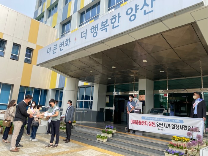 양산시는 19일 시청과 비즈니스센터에서 출근하는 직원 및 시민들을 대상으로이해충돌방지법 시행에 따른 제도 홍보 캠페인을 펼쳤다고 밝혔다.