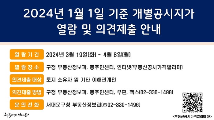 개별공시지가 열람은 서대문구청 부동산정보과 및 동주민센터에서 가능하며 서대문구청 누리집, 부동산공시가격알리미에서도 확인할 수 있다.