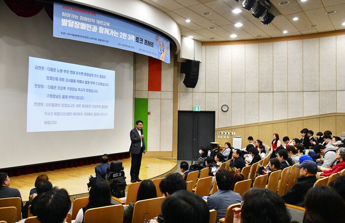 오승록 서울 노원구청장이 23일 구청 6층 소강당에서 열린 ’찾아가는 장애인식 교육‘에 참석했다. 사진은 장애인식 교육에 참석한 오 구청장이 인사말하는 모습. (사진=노원구청 제공)