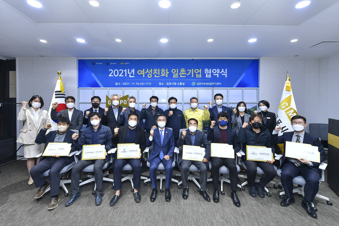 | ▲ 2021년 11월10일 김포시청 소통실에서 열린 여성친화 일촌기업 협약식에서 정하영 시장이 관계자들과 기념사진을 촬영하고 있다. (사진제공=김포시청) |