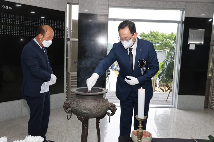 | ▲ 명현관 해남군수, 6일 제67회 현충일 맞아 해남읍 우슬체육공원 내 현충탑 일원에서 순국선열 및 국가유공자의 숭고한 나라사랑 정신을 기리는 추념식 분향 모습 / 사진=해남군 제공 |