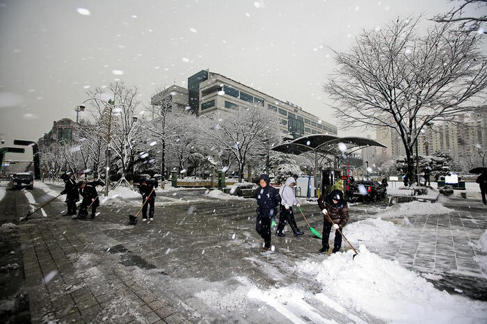 | ▲ 구청 전직원 동원 횡단보도 및 버스승강장 등 제설작업 실시했다. (사진=인천 계양구청 제공) |