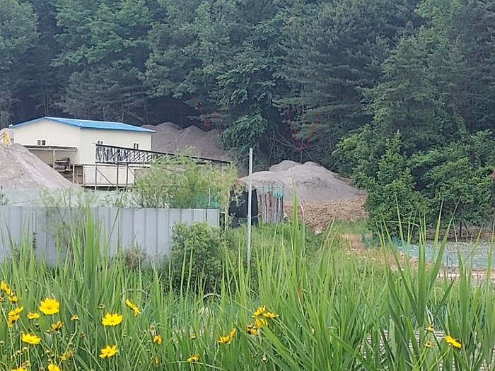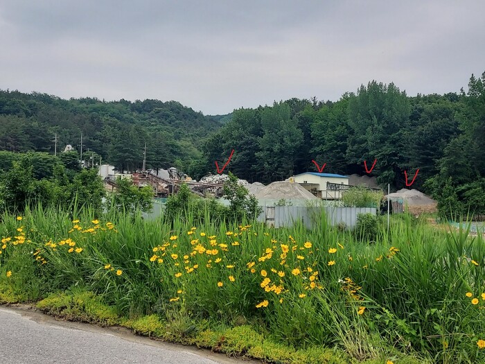 산림훼손은 낙동면 상촌리 산 137번지에 산을 일부 절토하여 파쇄된 재료를 보관하고 있고 공장내에는 파쇄하고 나온 석분 등이 방진덮개도 덮지 않은채 그대로 방치 보관하고 있다.