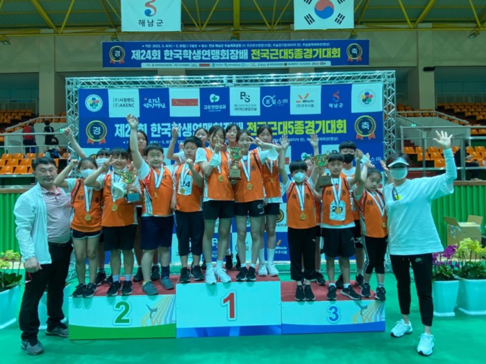 | ▲ 해남동초등학교 수영부 학생들이 지난 5일, 해남 우슬경기장에서 열린 ‘제24회 한국 학생 근대 5종 연맹 회장배 전국 근대 5종 경기 대회’에서 개인전 금메달 2개, 단체전 금메달 3개를 획득하는 쾌거를 이루고 기념촬영을 하고 있다. / 사진=해남동초등학교 제공 |