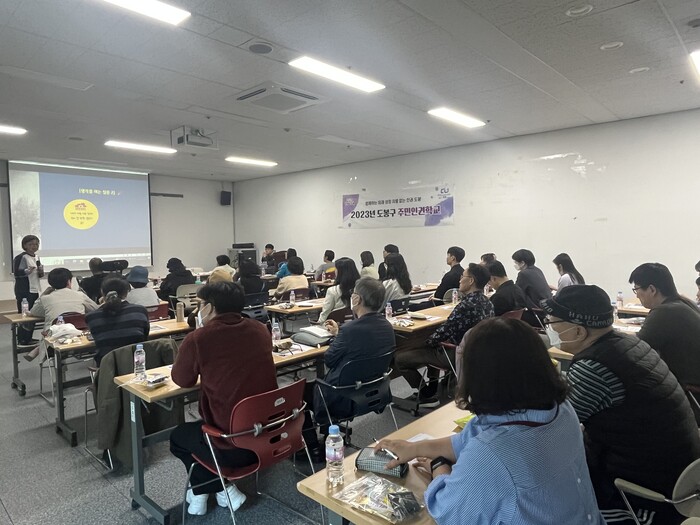 | ▲ 주민인권학교 참여자들이 강사의 설명을 듣고 있다. |