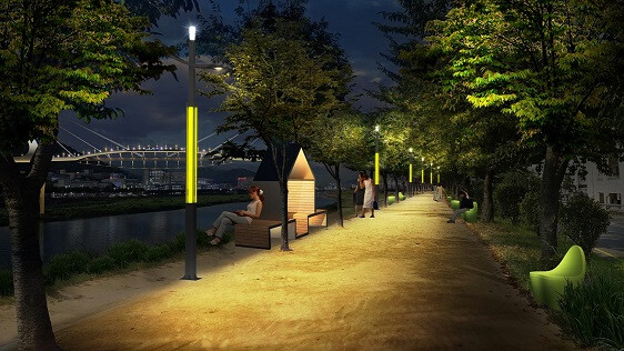 먼저 영대교 인근 둑마루길 초입부 50m구간 에는 투광등, 문라이트LED 등 등 기구 29개를 신규 설치해 조경시설물과 주변 공간에 조명색을 입혀 걷고 싶은 산책로, 감성 있는 산책로로 조성한다.
