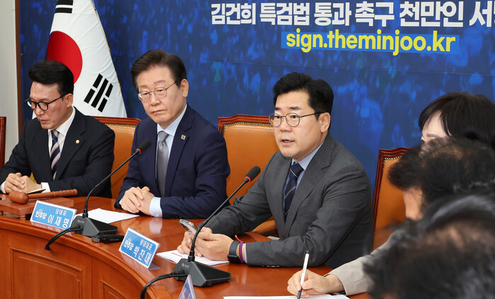 국민의힘을 향해서는 김건희 특검법 수용을 촉구했다. 박 원내대표는 "지금까지 제기된 의혹들에 대해 진상을 철저하게 밝히고 투명하게 털어내는 것이 그나마 보수 전체의 괴멸을 막는 유일한 길"이라며 "숨을 곳도 피할 곳도 없다. 한 대표는 이제 결단하라"고 한 대표를 압박하기도 했다.