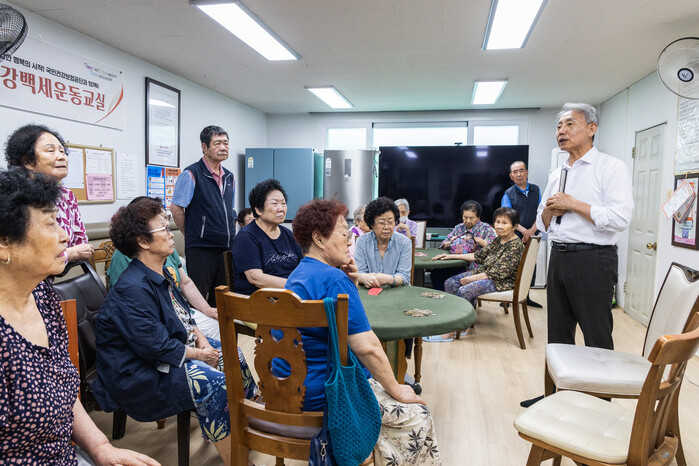 | ▲ 경로당을 방문한 윤환 구청장(오른쪽)이 노인들과 이야기를 나누고 있다. (사진=인천 계양구청 제공) |