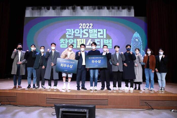 | ▲ 지난해 관악S밸리 창업페스티벌에 참석한 박준희 구청장(가운데)이 참여자들과 기념촬영을 하고 있다. (사진=관악구청 제공) |